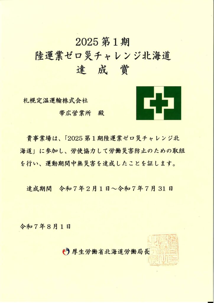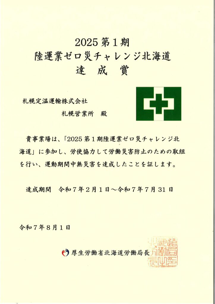 2025年2月~7月を対象期間とした「陸運業ゼロ災チャレンジ北海道」第1期において、札幌・帯広・旭川の3エリアが無事故を達成しました。