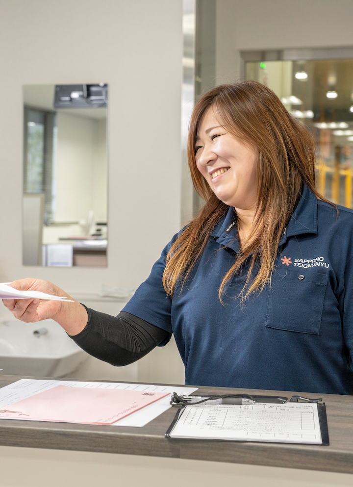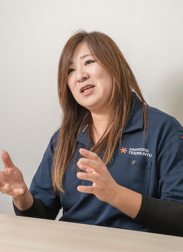 ずっとドライバーの仕事に興味があったのですが、子育て中はなかなか始められず、念願叶ってこの仕事に就くことができました。札幌定温運輸への入社前は、個人宅への配送の仕事も経験して、当社に入社してから大型の免許も取得したんです。乗務員の仕事を始める前は、業界的に厳しい上下関係というか、体育会系の雰囲気があるのかなと思っていましたが、実際に当社へ入社してみると、先輩ドライバーの皆さんが「大丈夫か?」「仕事は慣れたか?」と気さくに声をかけてくれたり、ときには作業を手伝ってくれたりと、思っていた以上に優しくて温かい雰囲気でした。また、荷物の量も無理のない範囲で平等に割り振られていて、働きやすい環境が整っていると感じます。専属の整備士が常駐している点も心強く、安心して業務に集中できるのがありがたいです。札幌定温運輸では定期点検や車に不具合が起きる前の保全活動も徹底していて、オイル交換や修理なども対応してもらえますし、車両について不明なことがあった時もすぐに「ちょっと見てください」と相談できるので、とても安心できるんですよ。