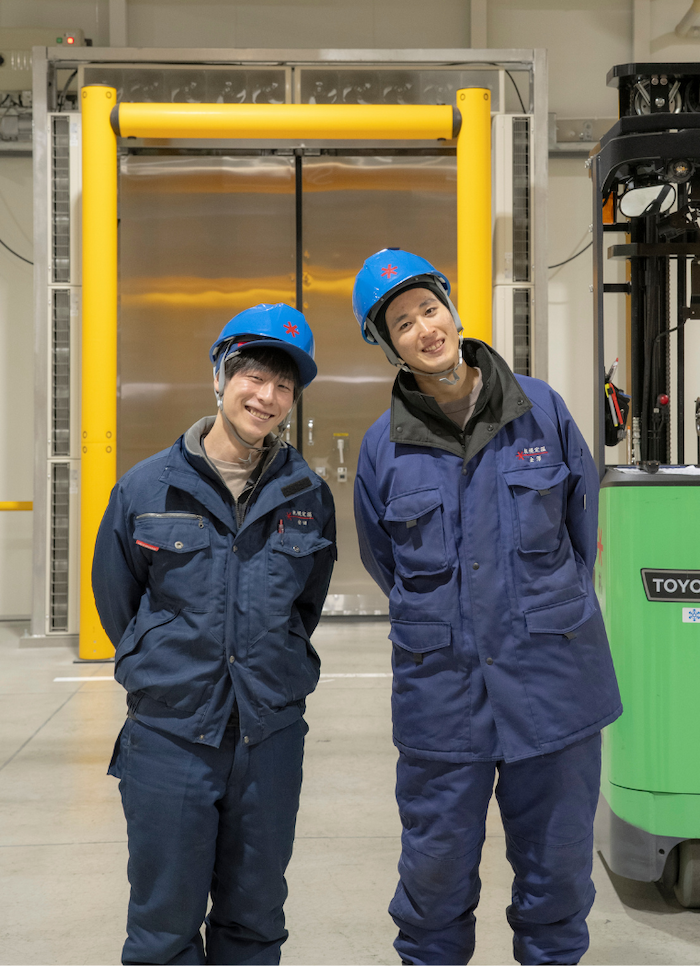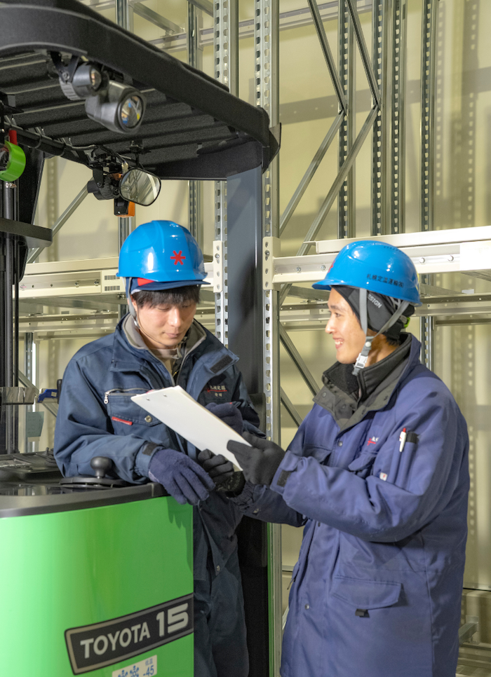 Y.Dさん フォークリフトを使った作業が多くありますが、会社が免許取得をサポートしてくれます。私も始めは全然うまく運転ができず、ハンドルの正しい位置がつかめずに戸惑うこともありました(笑)でも、先輩が丁寧に教えてくれましたし、後輩たちもみんなしっかりと覚えています。未経験からでもプロを目指せる環境なので、ぜひチャレンジしてもらえればと思います。